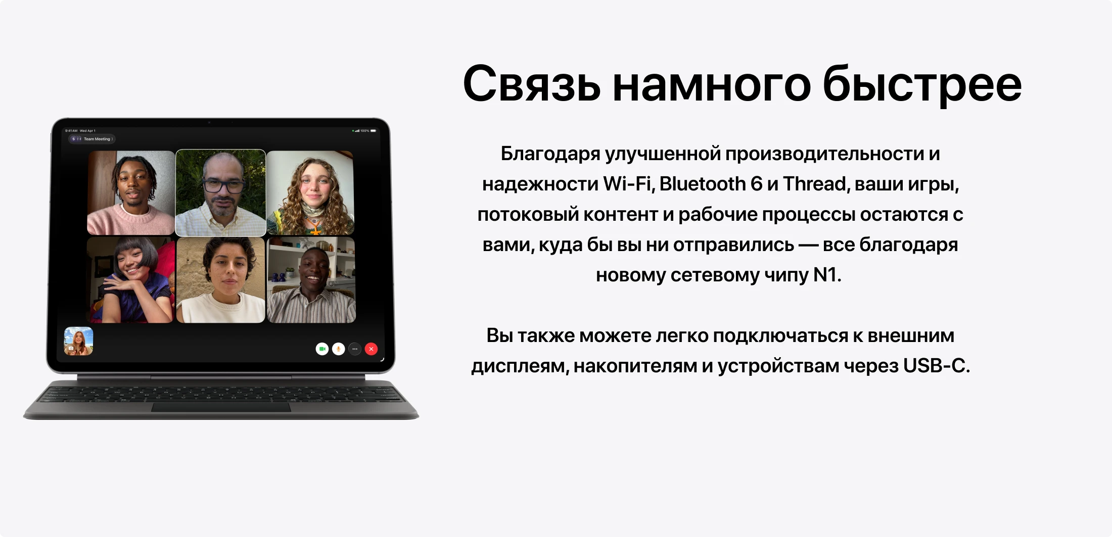 Это обновление, которое не видно глазом — и которое ощущается каждый день. Чип Apple N1, впервые появившийся в iPhone 17, принёс iPad Air поддержку Wi-Fi 7: скорость соединения с совместимым роутером теоретически втрое выше, чем у Wi-Fi 6E. На практике важнее другое — N1 значительно улучшает стабильность Personal Hotspot и AirDrop, которые теперь работают надёжнее между устройствами Apple. Добавлен Bluetooth 6 и поддержка протокола Thread для экосистемы умного дома.