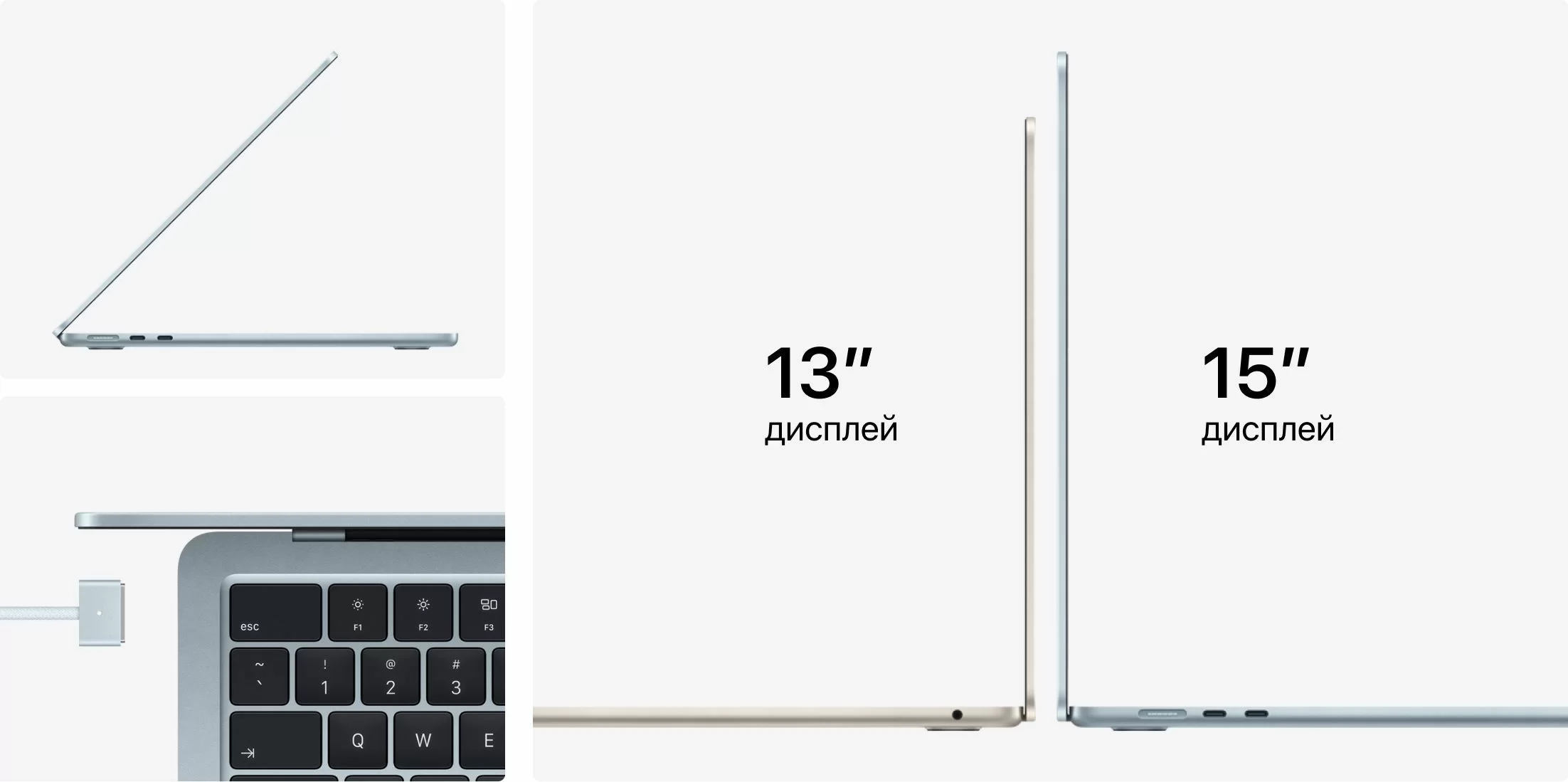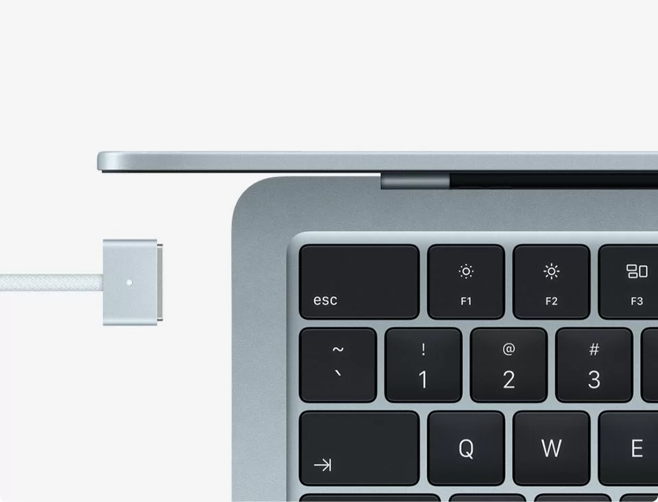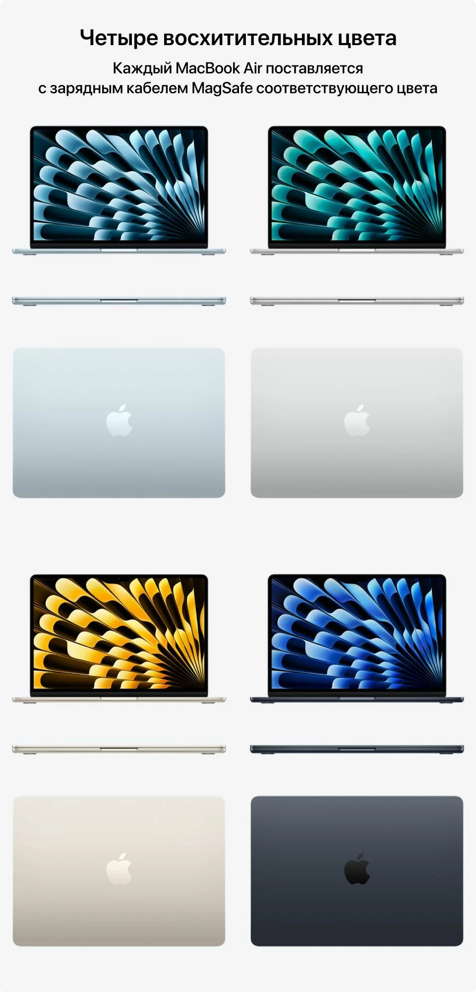 Четыре цвета на выбор — Sky Blue, Silver, Starlight и Midnight. Каждый MacBook Air поставляется с кабелем MagSafe в тон корпусу.