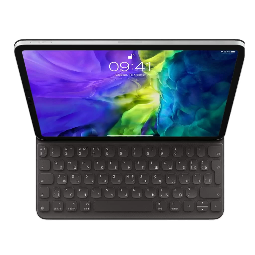 На новой Smart Keyboard Folio очень комфортно печатать. При этом её удобно носить с собой. В сложенном виде она становится лёгкой и прочной обложкой, которая защищает новый iPad Pro с обеих сторон. Доступна в двух размерах — для iPad Pro 11 дюймов и 12,9 дюйма. Клавиатура подключается одним касанием и сразу готова к работе.